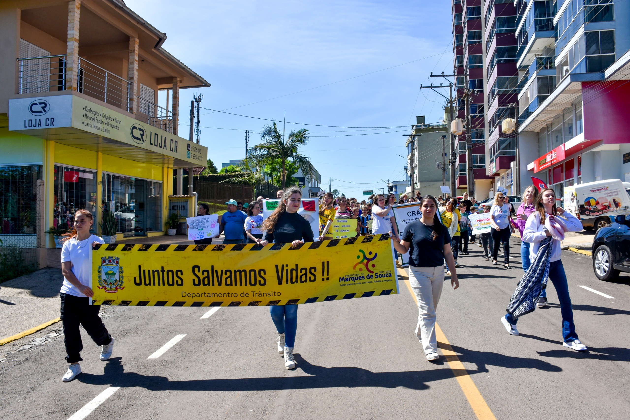 Aproximadamente 300 pessoas, entre estudantes, autoridades locais e membros da comunidade, participaram da 2ª Caminhada do Trânsito, promovida pelo Departamento Municipal de Trânsito.