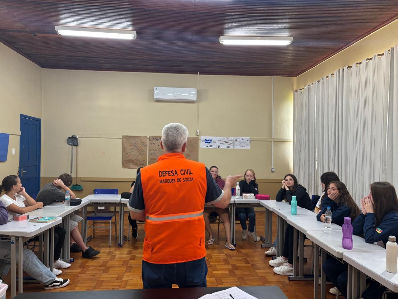 Alunos do ensino médio da Escola Estadual Ana Néri participaram de uma série de palestras voltadas à conscientização e preparação para situações de emergência. As atividades envolveram seis turmas dos turnos diurno e noturno. Foram abordadas noções básicas de Defesa Civil e ações importantes que podem ser aplicadas no dia a dia.