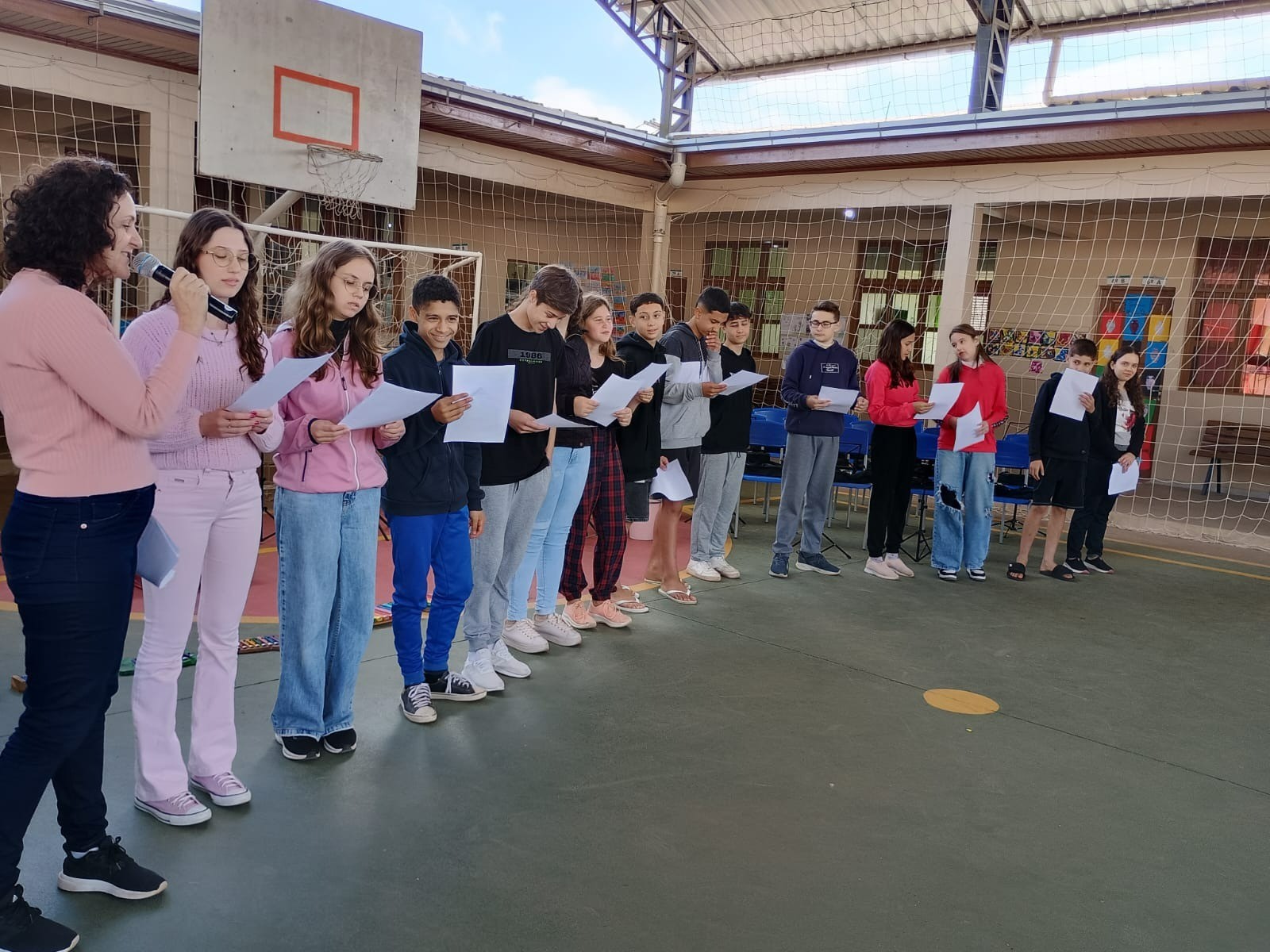 Flores, livros e poesia marcaram o Sarau da Primavera, realizado na Escola Carlos Gomes. O momento foi organizado com muito carinho pelos professores Patrícia Krahn, Paulo Jardel Andres, Diulia Lohmann e Nair Cavaterra.