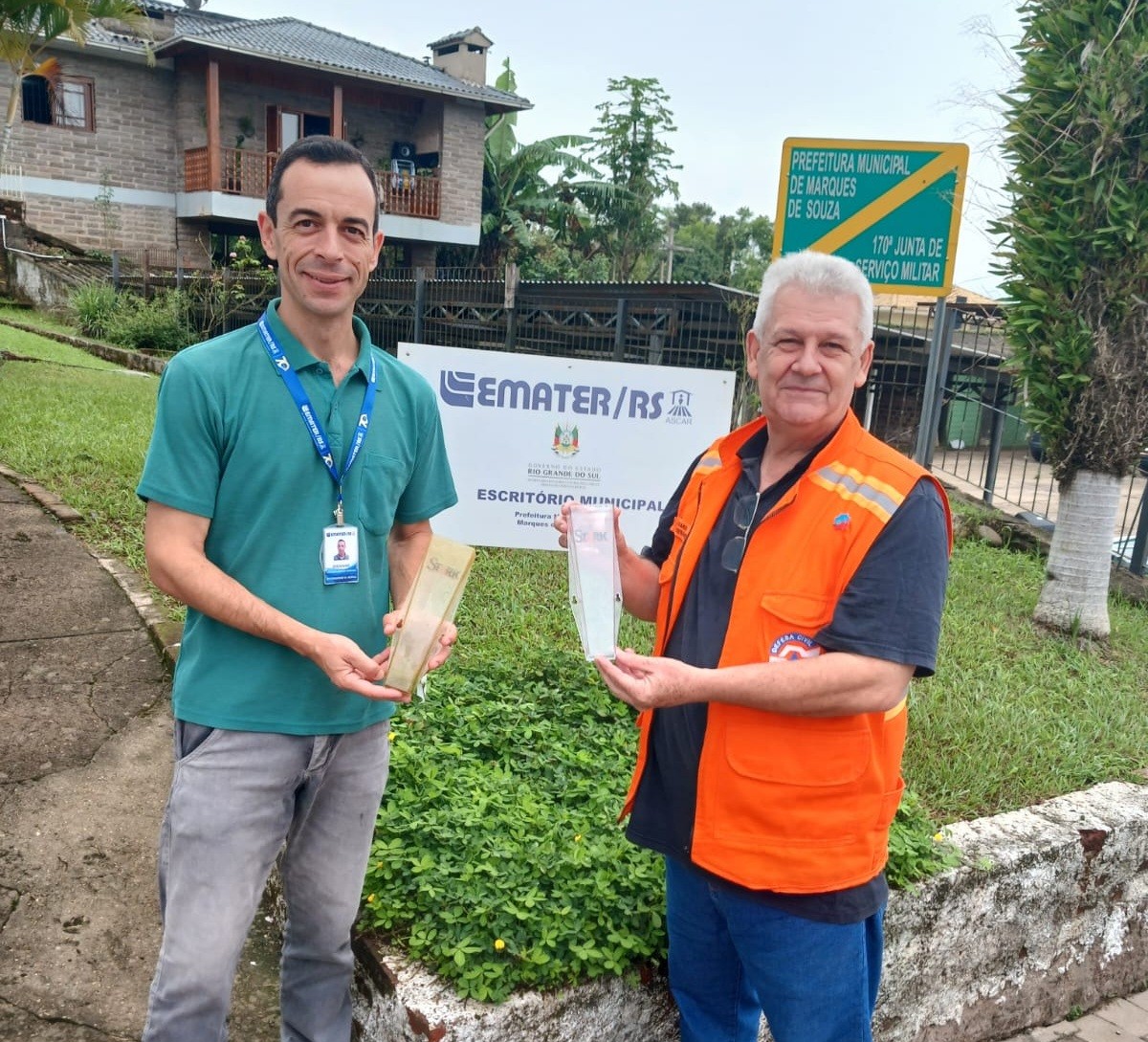 O coordenador da Defesa Civil, Ricardo Kich, realizou a doação de um pluviômetro ao chefe do escritório da Emater/RS-Ascar, Diovane Ferreira Cardoso, com o objetivo de fortalecer o monitoramento climático no município.